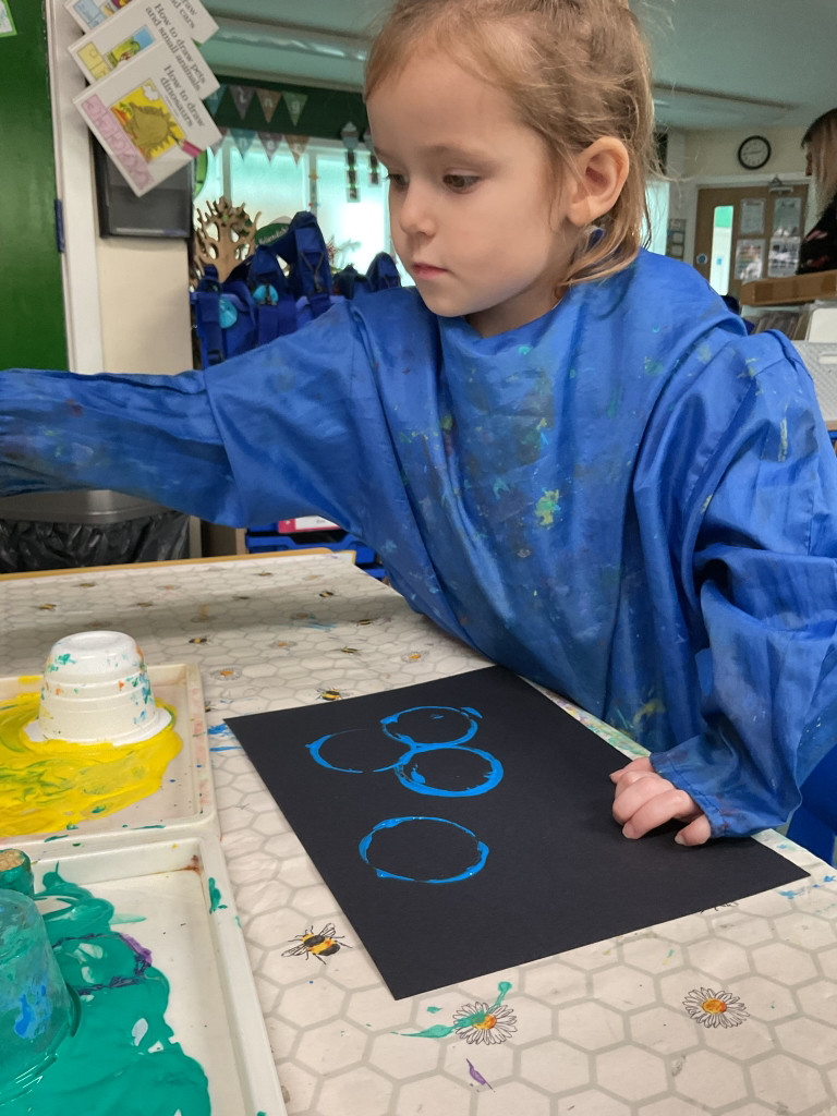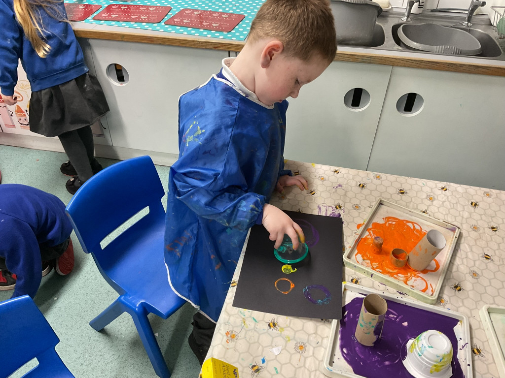 We had a lovely time listening to The Smartest Giant in Town by Julia Donaldson as part of our Christian value of kindness. We talked about all the kind acts the giant did and how we can show kindness too. The children enjoyed printing colourful ties and socks for the giant, learning how to lift the stamp carefully to make a neat shape. We also practised naming the shapes we used — square, circle, triangle, rectangle and star. It was a fun and thoughtful activity for everyone!